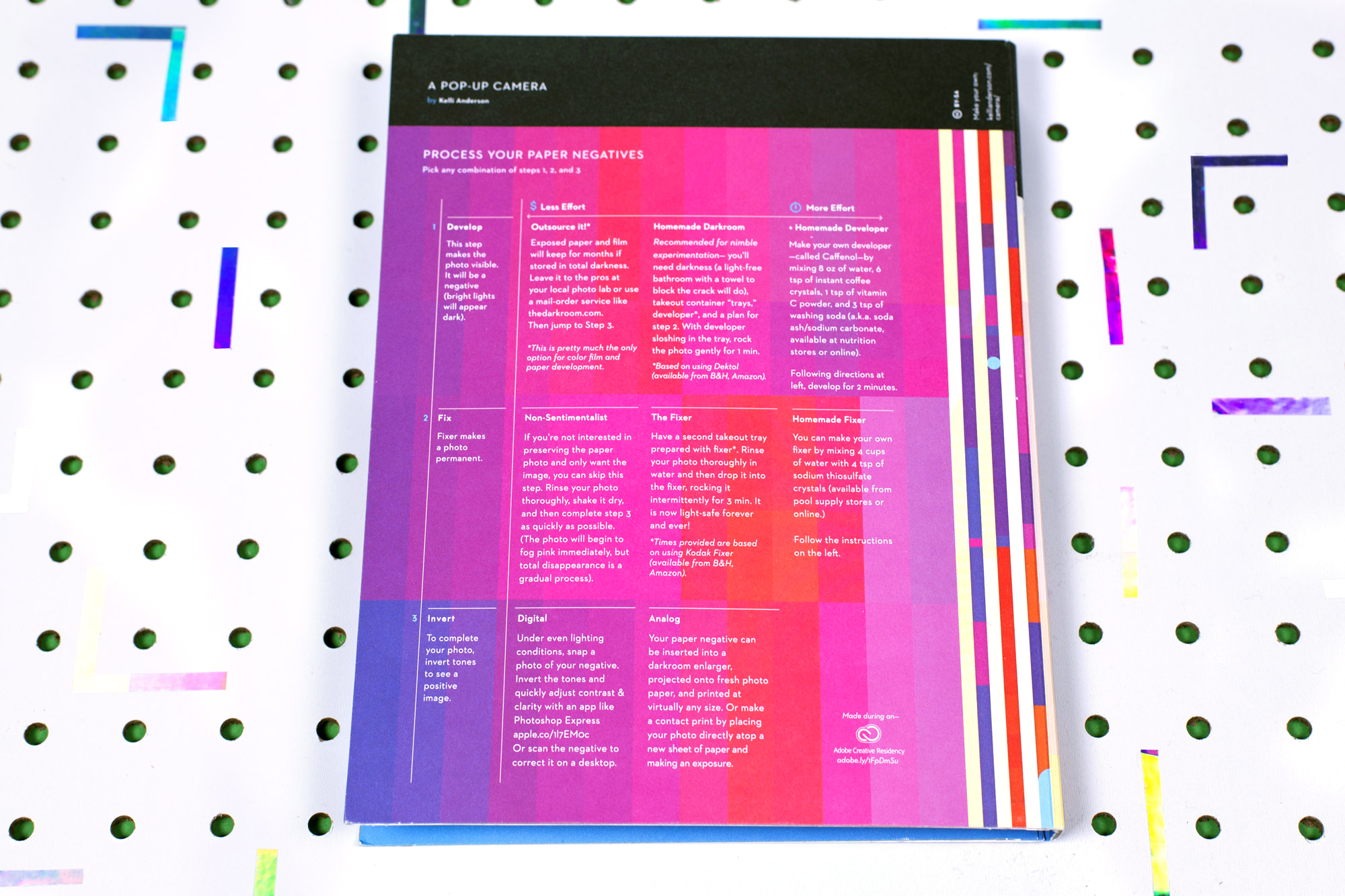 La artista visual y diseñadora gráfica Kelli Anderson es autora de diversas propuestas emergentes, como la que publicó en 2015, Este Libro es una Cámara (This Book is A Camera), un libro pop-up que se convierte en una cámara estenopeica (pinhole). El libro actúa como una herramienta didáctica para ayudar a comprender la manera en que se forma la imagen, incorporando los elementos básicos necesarios y suficientes para realizar fotografías: una caja estanca a la luz, un soporte sensible y un diminuto agujero que funciona como objetivo.
