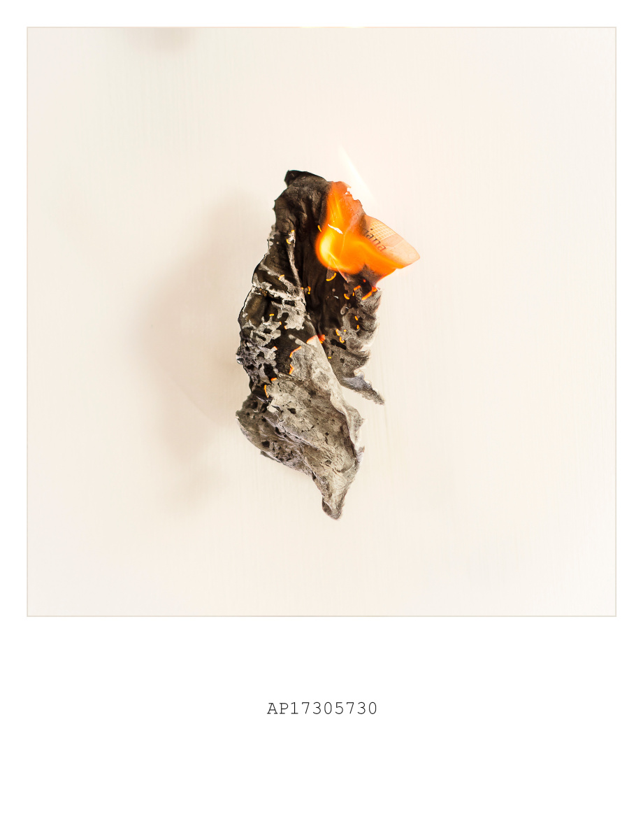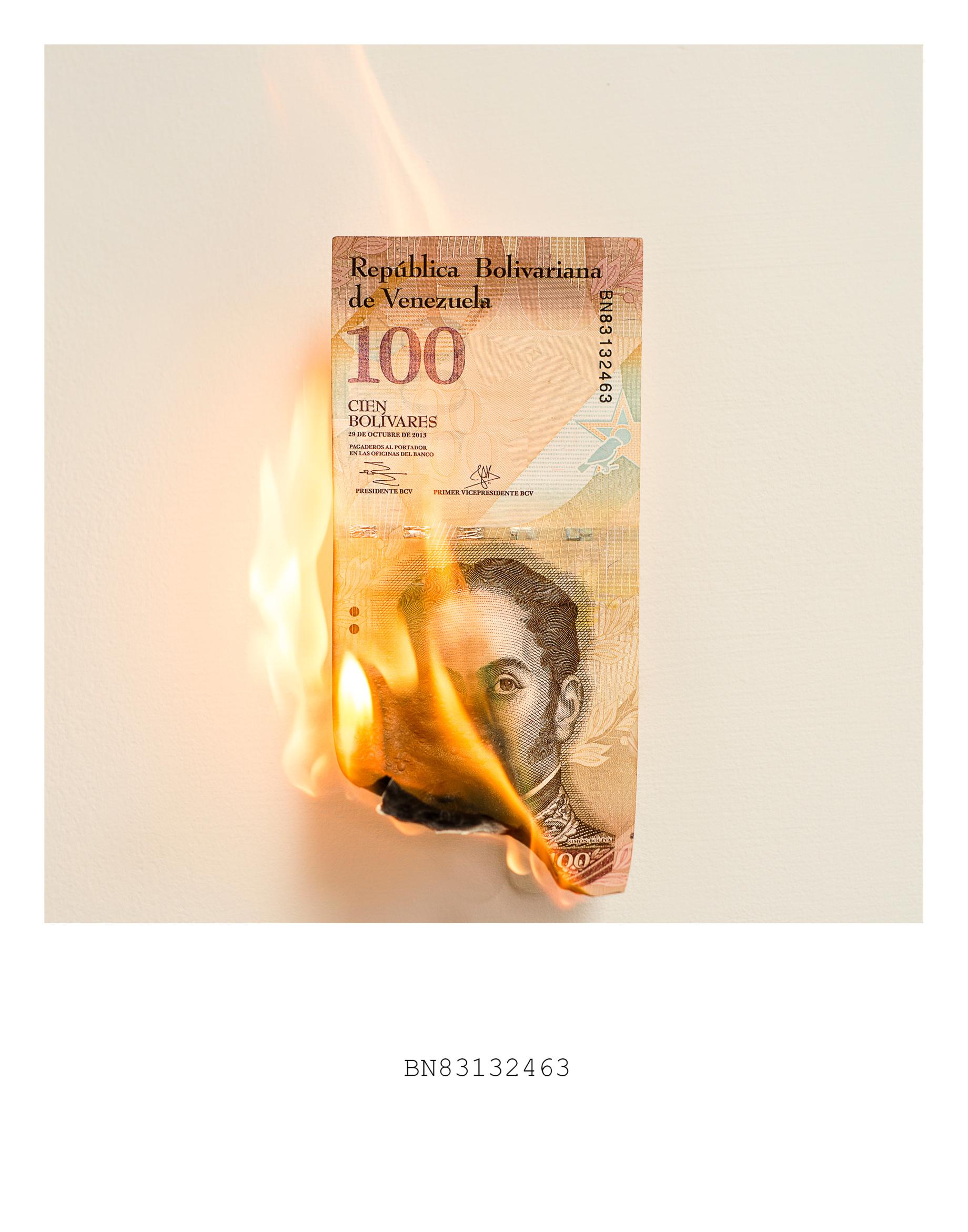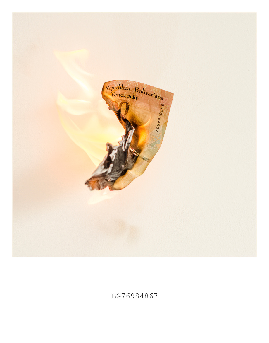 Así, una patria concebida “con voluntad precisa de fracaso” arde en llamas como el billete de 100 Bolívares que muchos quemaron al creerlo obsoleto, finado, Sin Efecto. Ante esto, Jesús Briceño disecciona a través de fotografías el proceso de incineración de una economía volátil, absurda e incompresible en 33 partes, que sumadas (en diciembre 2016) reflejarían el valor del dólar paralelo: 3.300 Bs. Hoy (12-01-2018), 168.469,65.