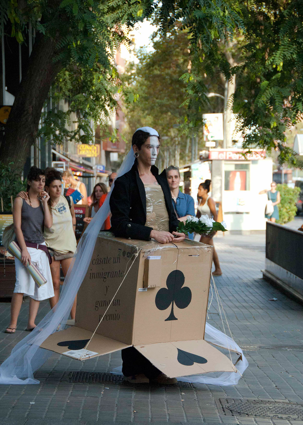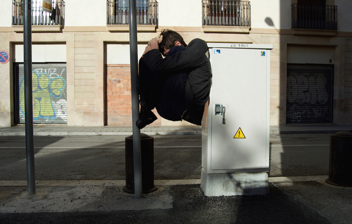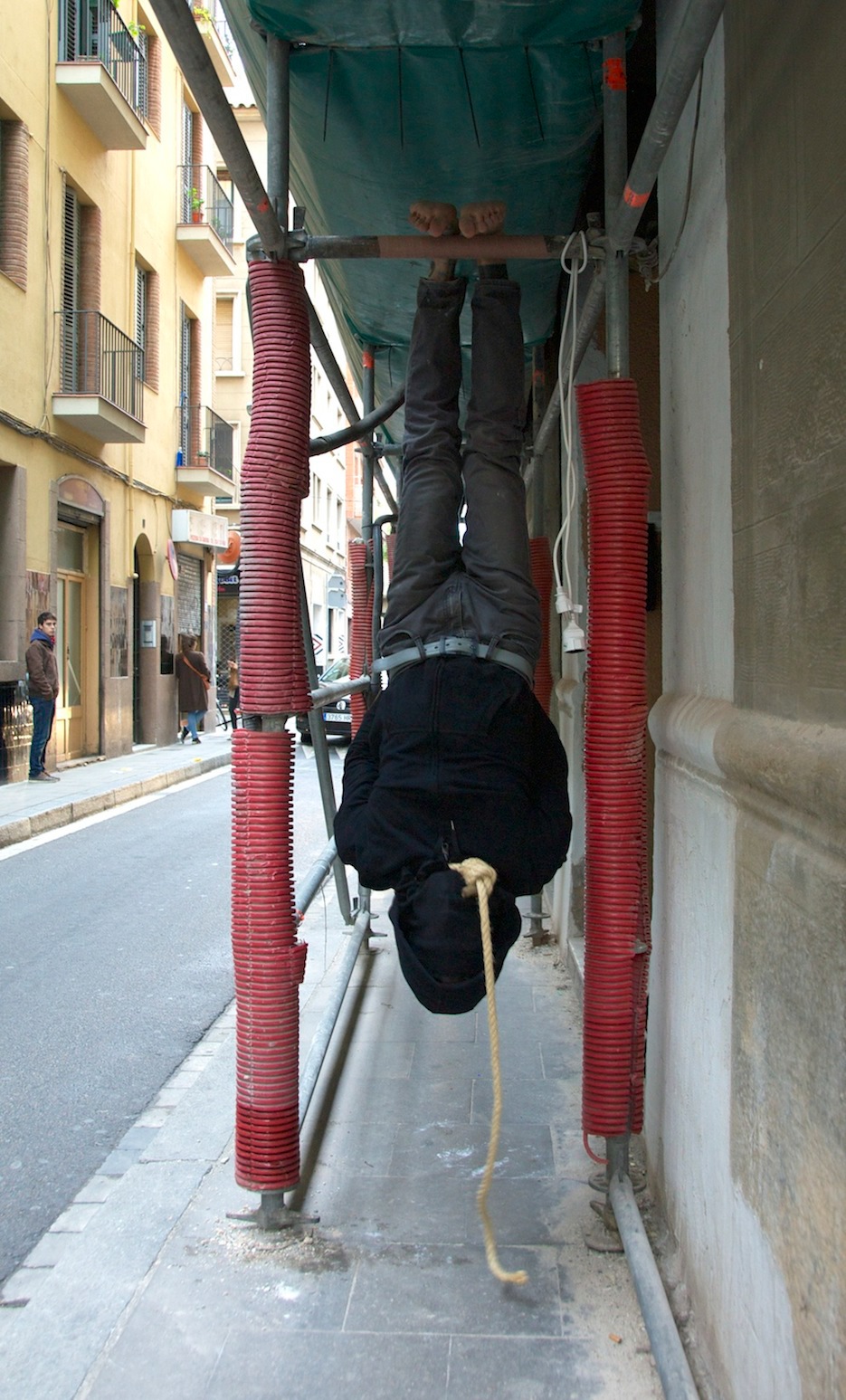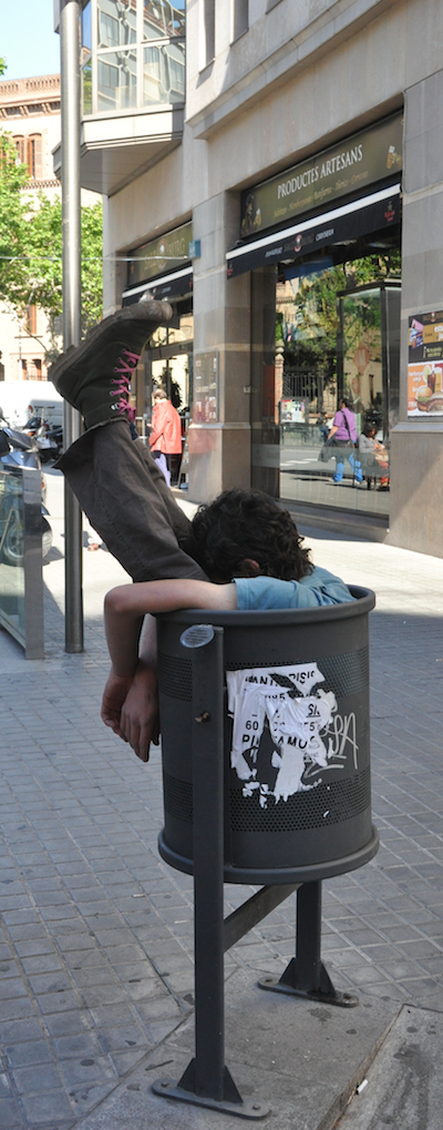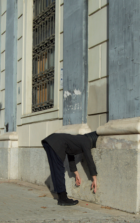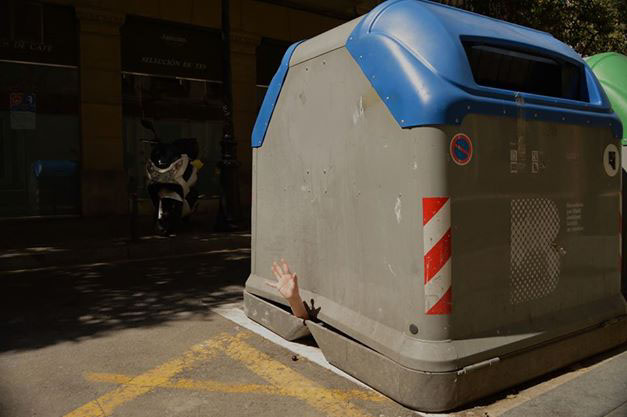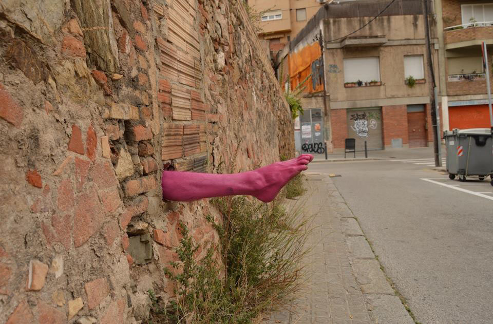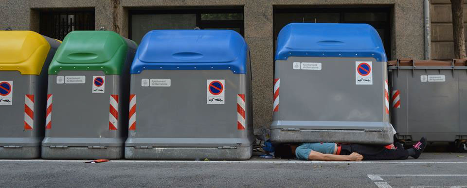 Misfita con su serie “Parásito” nos recuerda que ser ciudadano en urbes como Barcelona y desplazarse por ella es saber una coreografía específica: si te equivocas en un paso puedes ser “el que arruina la fiesta” e incluso ser expulsado. Los tránsitos están demarcados, los mobiliarios públicos como los asientos están hechos para que a nadie se le ocurra recostarse, las entradas de los ventanales que podrían funcionar como asientos en espacio público los llenan de púas. Y la famosa dicotomía civilización/salvajismo se devela en los espacios demarcados donde sólo allí los árboles pueden crecer. Todo está “por algo” y “para un uso específico”, pareciese que hemos perdido la posibilidad de reinventar nuestros espacios y lugares habitables en la cotidianidad.