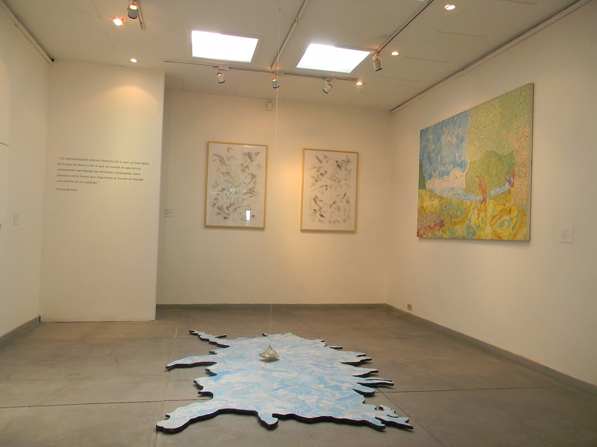 Comencé a hacerme plenamente consciente del aspecto político de mi obra a partir de un proyecto de 2010, animado por críticas y reflexiones de quienes lo vieron en el Pabellón Artecamara de ArtBo. La primera pieza era un collage de mares (de atlas) sobre una pieza de madera; unos imanes incrustados en la madera hacían mover una isla suspendida encima. Ese móvil estaba acompañado por dos collages sobre lienzo.