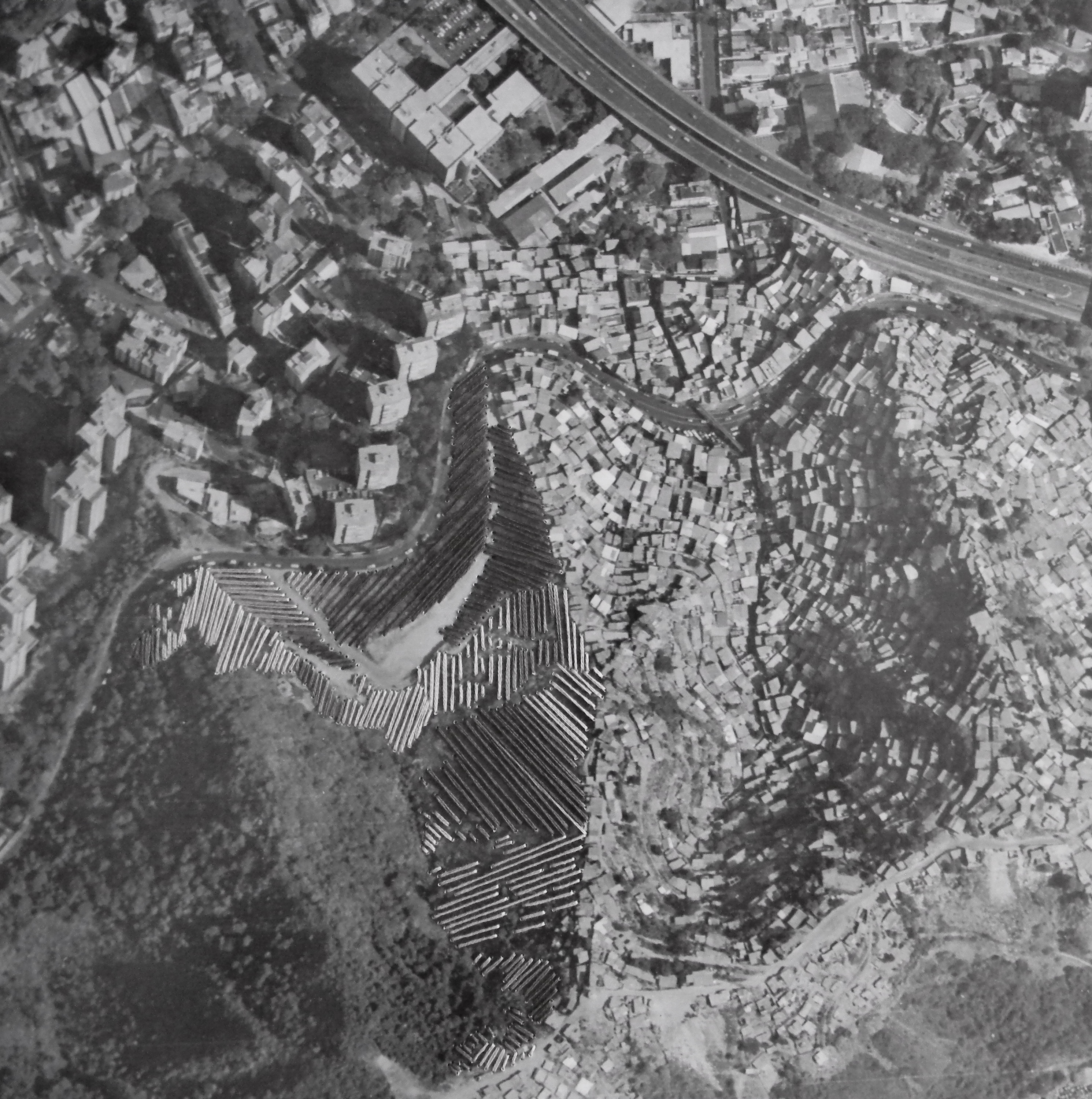Me intriga cómo luego de haber desarrollado un lenguaje basado en observación directa y dibujo a lápiz, tu producción en la residencia El Avispero se fundamenta en fotografías aéreas de Caracas. Saltas de manejar una perspectiva muy orgánica y horizontal del paisaje a emplear imágenes cenitales que representan una perspectiva “sobrehumana” (la vista cenital sobre el territorio no es algo que nuestros ojos humanos están acostumbrados a poseer).