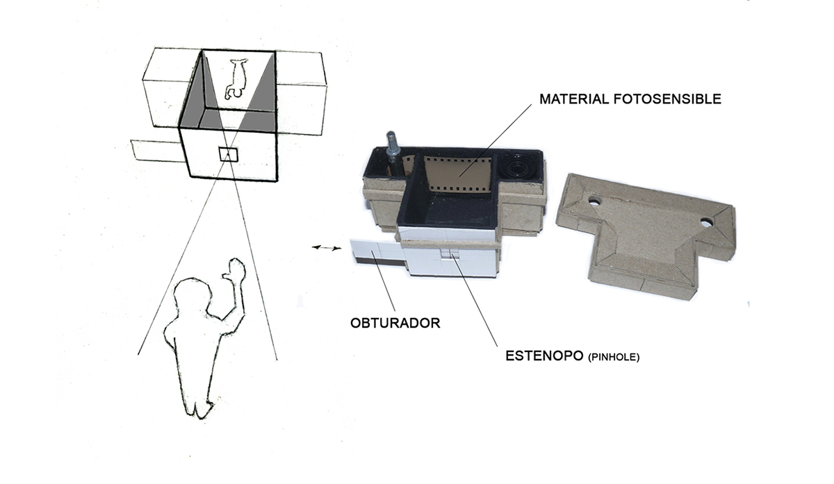 Las cámaras únicamente están constituidas por un recipiente hermético a la luz que tiene en uno de sus lados un pequeño orificio de diámetro similar al de una aguja, llamado estenopo o pinhole en inglés, y en el lado opuesto a éste se sitúa un material fotosensible (papel fotográfico, negativos, sensor digital).