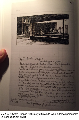 El libro “Edward Hopper, pinturas y dibujos de los cuadernos personales”, editado por La Fábrica en 2012, me ha estado acompañando desde hace más de un año. En ese libro he encontrado respuestas maravillosas a algunos de los misterios con los que nos enfrentamos en la creación fotográfica, en general, pero sobre todo en la dinámica analógica. El libro presenta las páginas de unos cuadernos que Edward Hopper y su esposa llevaban a modo de registro de inventario y contable de su obra; de hecho son cuadernos de contabilidad de tres columnas en los que Hopper hacía dibujos a plumilla de sus obras, incluía algunos comentarios, los cuales eran complementados por su esposa, quien añadía la fecha y monto de la venta de cada obra.
