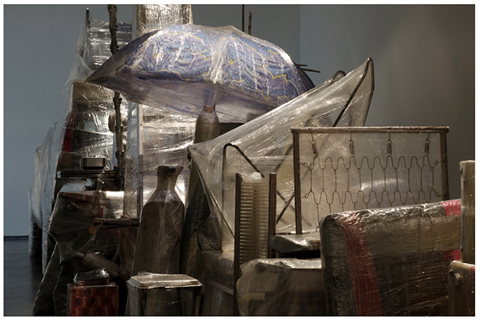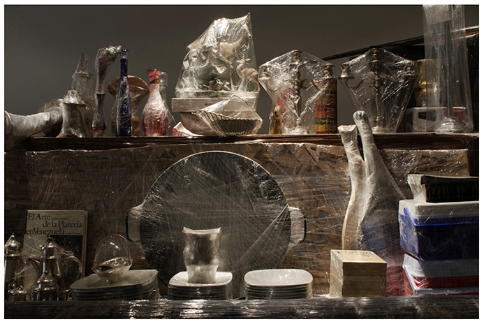 Y es justo en ese momento, en esa decisión de escapar, que en el ser emocional del sujeto comienza una transformación en la que se expresa la deriva del desplazamiento, de la dispersión de los trayectos que le conforman, pues cada uno sólo será una pequeña historia en reinvención permanente. Microhistorias que en la ‘Crisálida’ son encapsuladas en una delgada y transparente película de polietileno que desfigura su fisicidad, cada una ha sido cuidadosamente embalada, a la espera de su traslado, y al igual que en los recuerdos se tornan borrosas sus presencias, pues todo el conjunto de objetos vuelve a ser embalado de nuevo, en medio de la enunciación de un escape inconcluso.