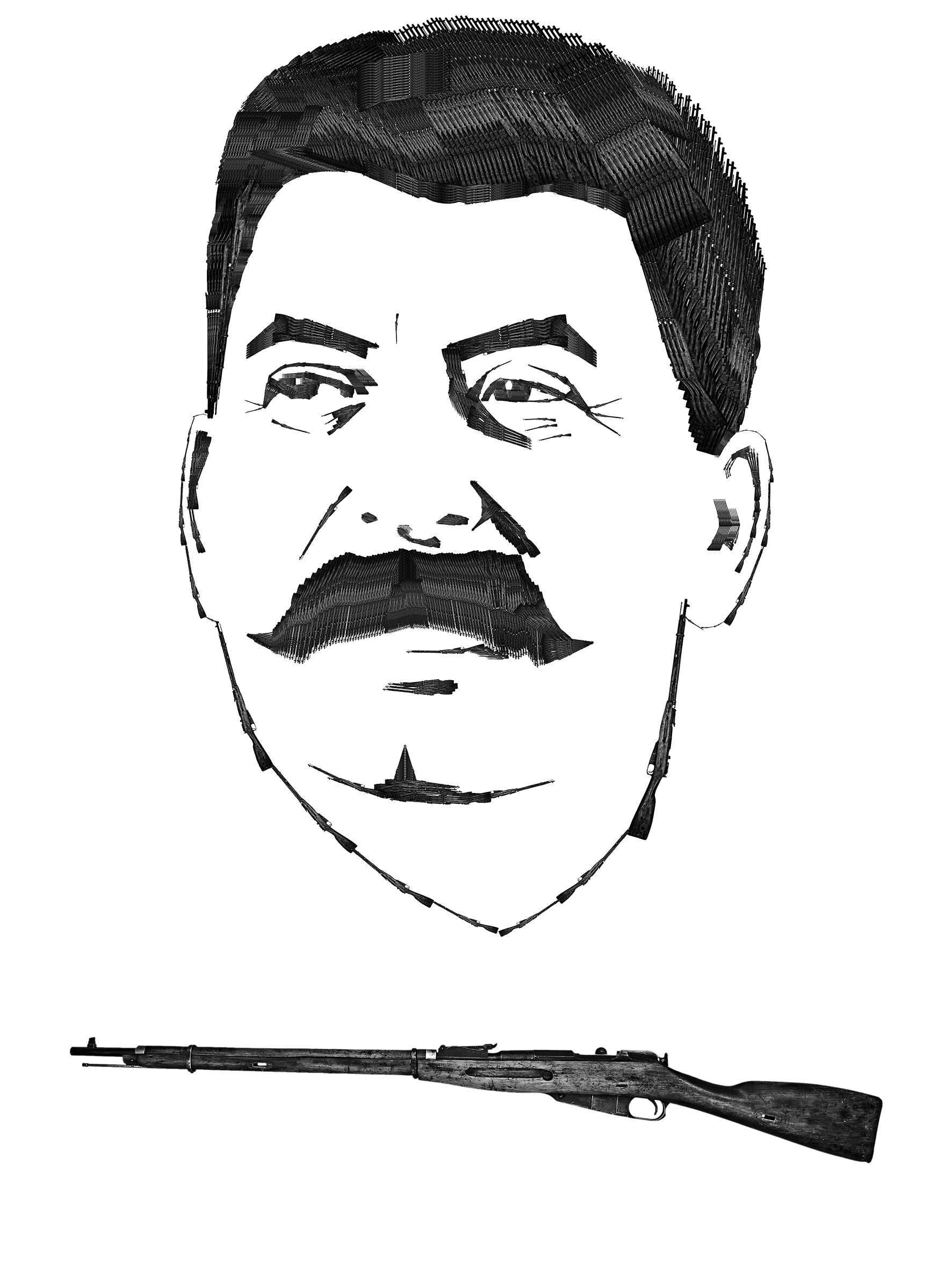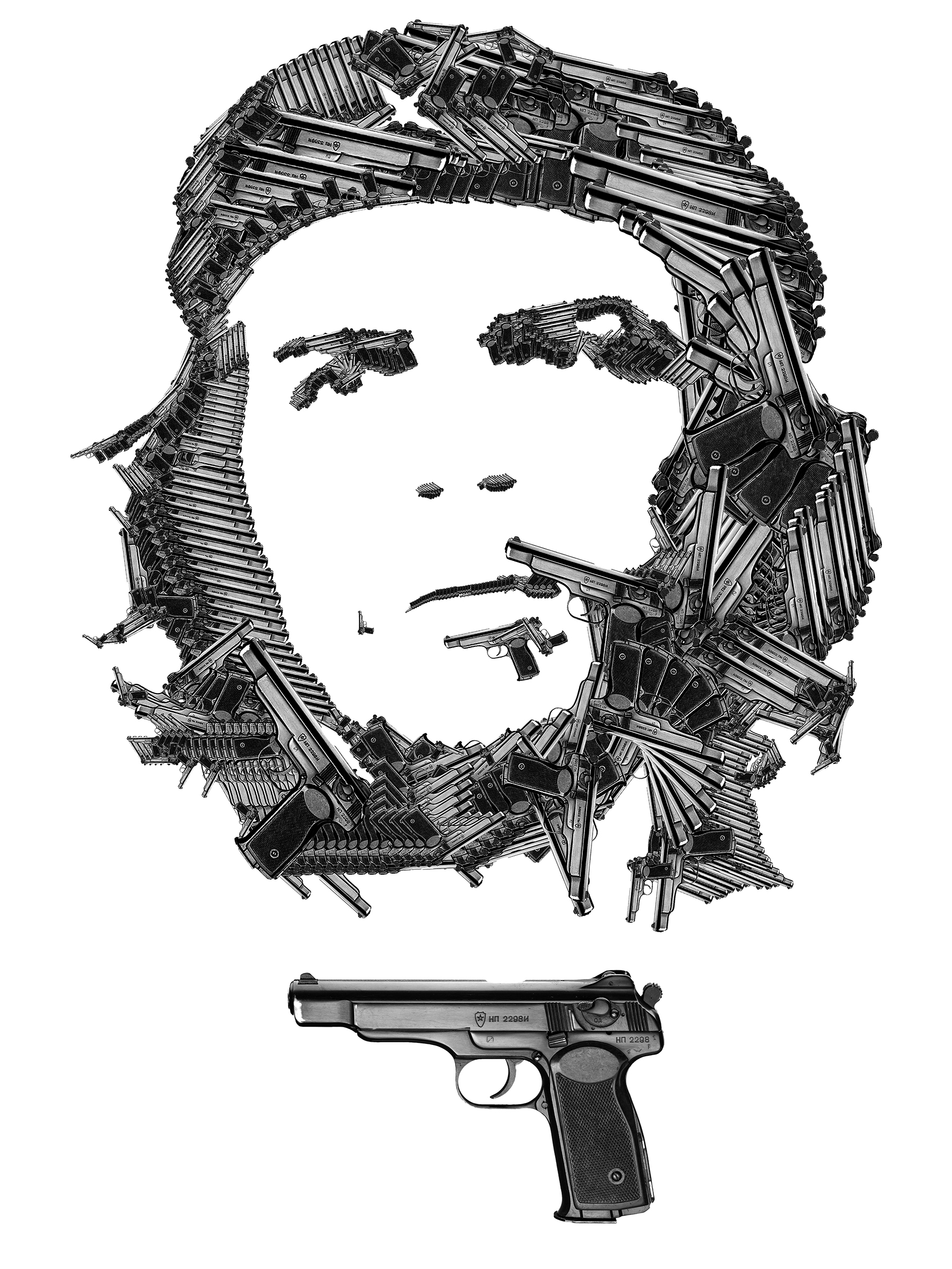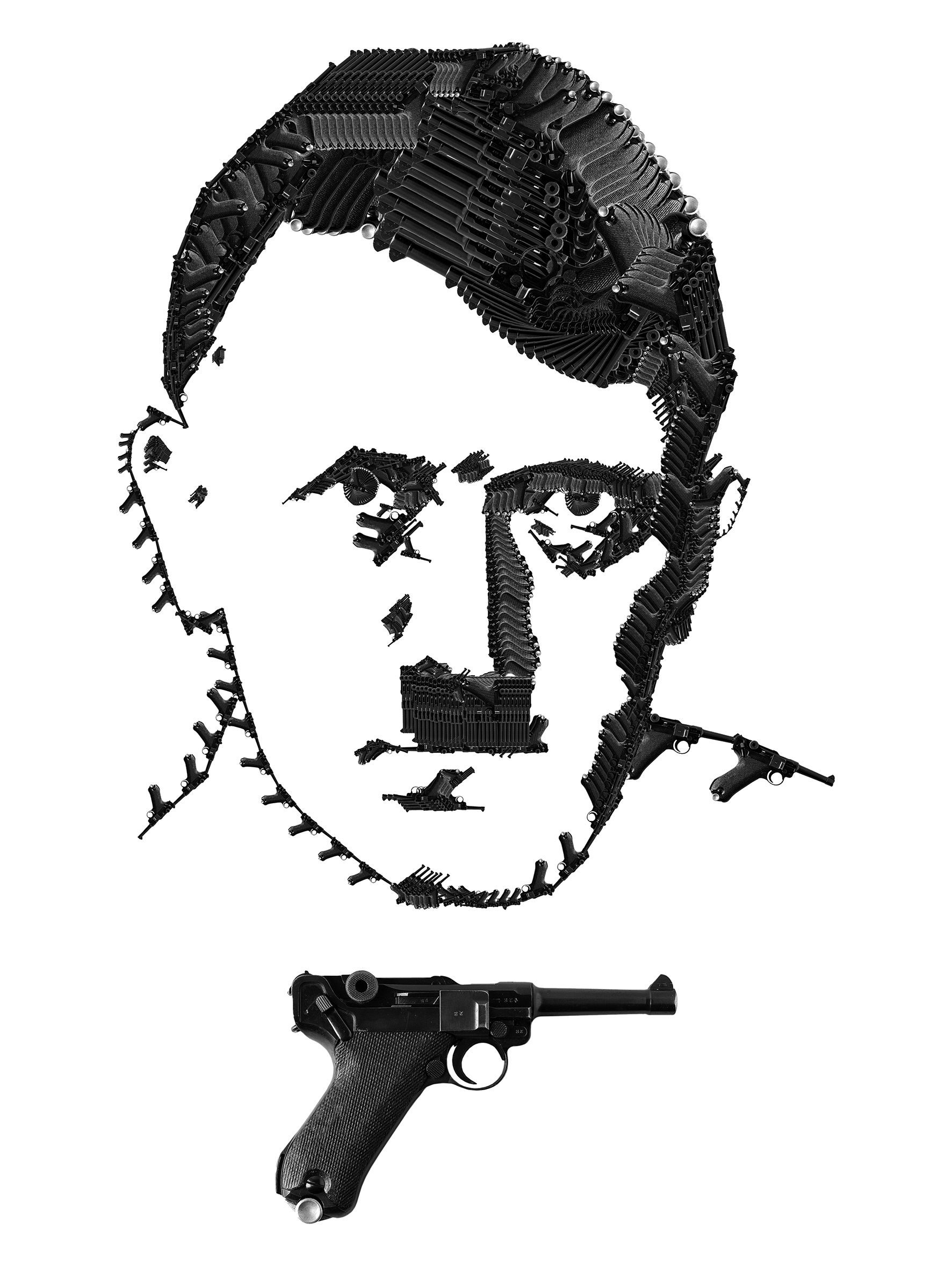 La inflexible creencia en una idea y su defensa a todo costo ha sido motivo de una gran cantidad de oscuros episodios de la historia universal, en la que líderes envilecidos han optado por exterminar a aquellos que se muestran disidentes ante su tiranía. El Marqués de Sade alguna vez dictó que “la espada es el arma de quien no tiene la razón”; sin embargo las dictaduras modernas se han encargado de transformar las espadas en fusiles, hasta el punto de afirmar que “el poder procede del cañón de un arma”, cincelando sus rostros en el imaginario colectivo internacional, y así convirtiéndose en motivo de la serie fotográfica de Arnaldo Utrera “Armas Caras” (2016), en la cual el autor reconstruye siluetas de personajes reconocidos históricamente como villanos a partir de la repetición del mismo elemento, en las que el odio, la venta de armas, el autoritarismo y la muerte se tornan una sola imagen.
