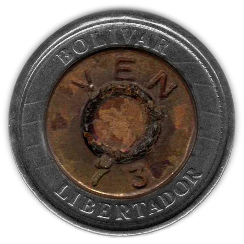 Aunque “¡Plomo al hampa!” se volvió un lema del gobierno tras su exclamación en el año 2000 (por parte de un alcalde oficialista que poco atacó a la delincuencia), la criminalidad continúa en ascenso y posiciona al país como el segundo más peligroso del planeta, dando lugar a un territorio en el que la vida y la muerte parecen valer los bolívares que valga una bala. Basado en esto, la corrupción de una economía devaluada y la perversión de los principios que nos hacen “humanos” se funden en los círculos concéntricos de “Bolívares para cañón” (2015), la serie de collage digital en la que Jesús Briceño (alias #BolivArte) expone de manera contundente la relación innegable entre la violencia, el poder económico y el presupuesto nacional.