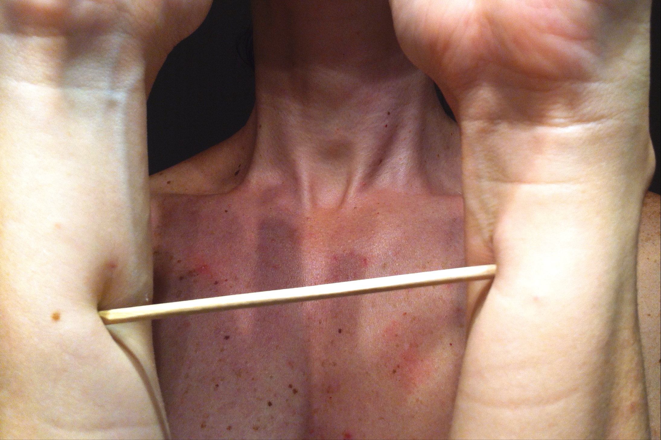 Con una mirada antropométrica Costanza De Rogatis observa este cuerpo desde la fotografía y la ambivalencia de ser comprendido como contenedor y contenido, habitable y habitante, construido y constructor. El cuerpo utópico y la convivencia con su antónimo tangible (el cuerpo humano) se vuelven el motivo de su serie “Aquí” (2017), en la que la artista experimenta y descubre “desde el mirar” las posibilidades infinitas de un territorio epidérmico, universo infinito de capas, manchas y texturas que cuentan a través del detalle de la piel que lo asombroso forma parte de nuestra realidad.