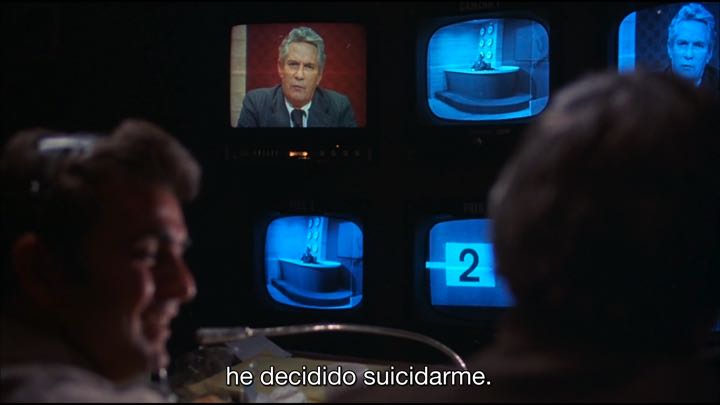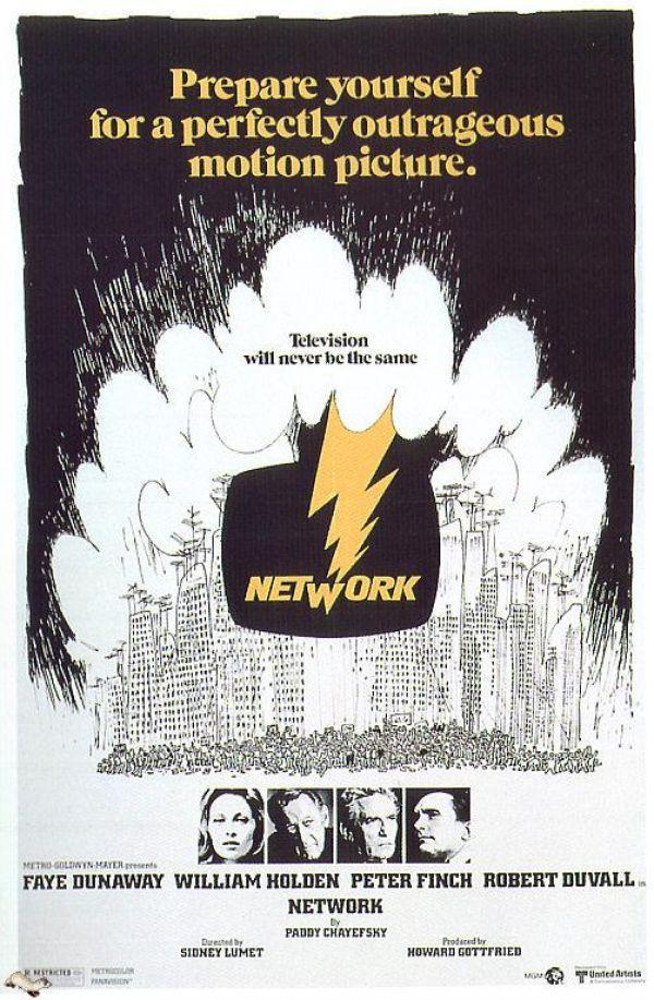 En “Network” el ancla de las noticias Howard Beale, un estupendo Peter Finch, ha caído presa de un ataque de nervios, y amenaza por transmisión nacional, suicidarse. La cadena de televisión (UBS), frente al pánico que tal oferta supone, decide despedirlo, pero descubren que los números han ido en alza, y nuestro, ahora más loco, ancla televisivo, puede ser la mina de oro ansiada para la compañía, tanto es así y tal poder de convocatoria tiene la ruptura de molde de Beale, que se encargan de hacerle su propio show, convirtiendo al pobre demente, en un títere de masas. Todo sea por el rating.