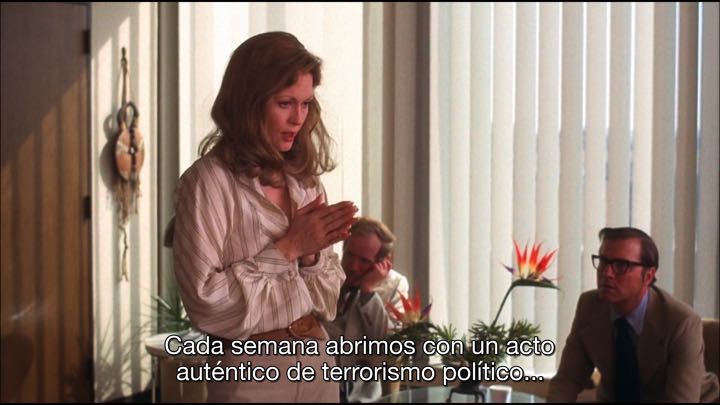 Entra en juego la ambición de Faye Dunaway, como Diana Christensen, una productora de entretenimiento que poco a poco irá escalando en sus ambiciones dentro de la empresa, pues si algo la define es su frialdad, su potencial calculador y su actitud lobezna y hará lo posible por subir los números de espectadores para la UBS. Es tanta su entrega y obsesión con la profesión que hasta en el acto sexual es incapaz de dejar de hablar de trabajo; como cereza del pastel, realizará un seriado televisivo con material de archivo de partículas terroristas robando bancos, y haciendo marramucias, y se aliará con una de las figuras más representativas del movimiento feminista, y de color, la activista Laureen Hobbs, interpretada por Marlen Warfield.