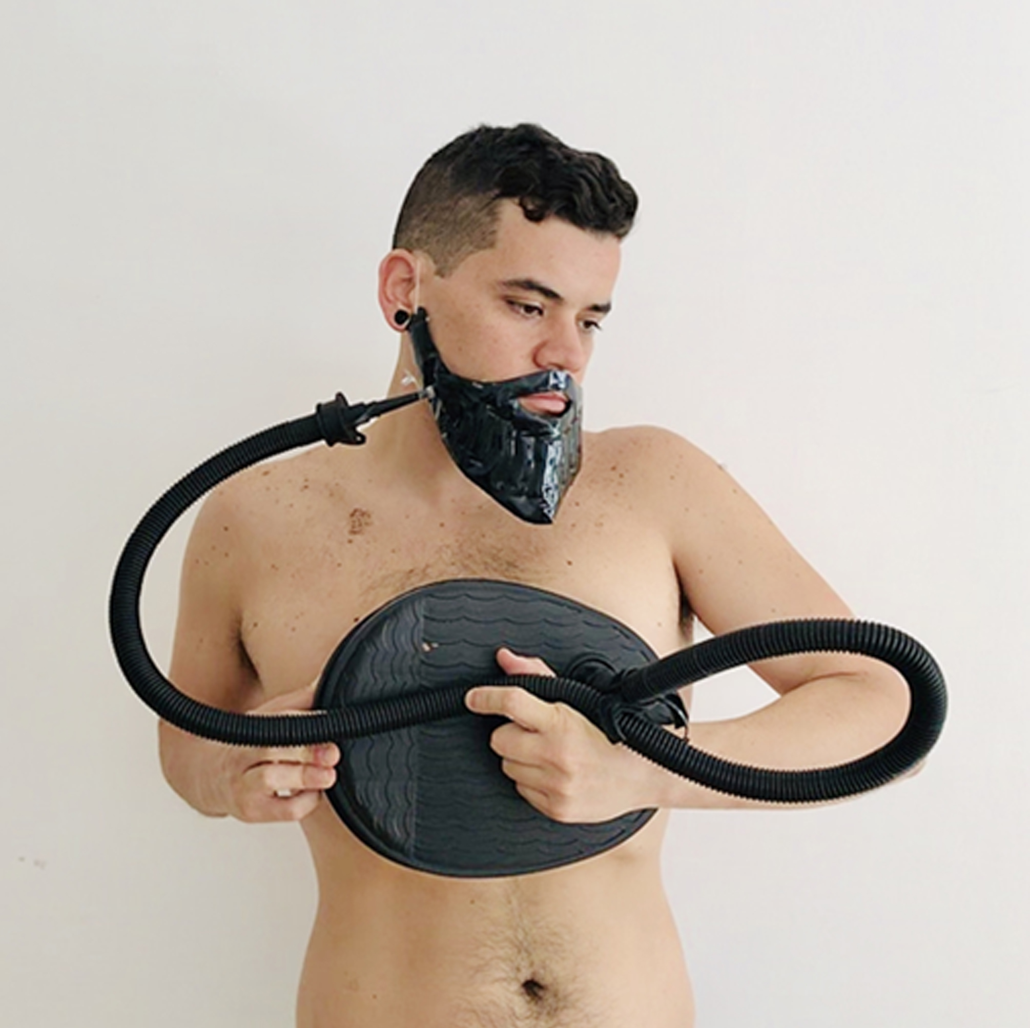 Hombría, como campo de fortaleza deseada en la fisicidad de la corporeidad del macho, velludo, del hombre duro, que es desmantelada en la transformación ejecutada en el videoperformance Barbarie (2019), del artista venezolano Max Provenzano quien coloca sobre su masculinidad mutante y reconciliatoria la imagen del hombre duro, heroico de todos los tiempos, a través de la ubicación de un simple aditamento con el que construye a esta narrativa: una potente barba inflable. (Img.4)