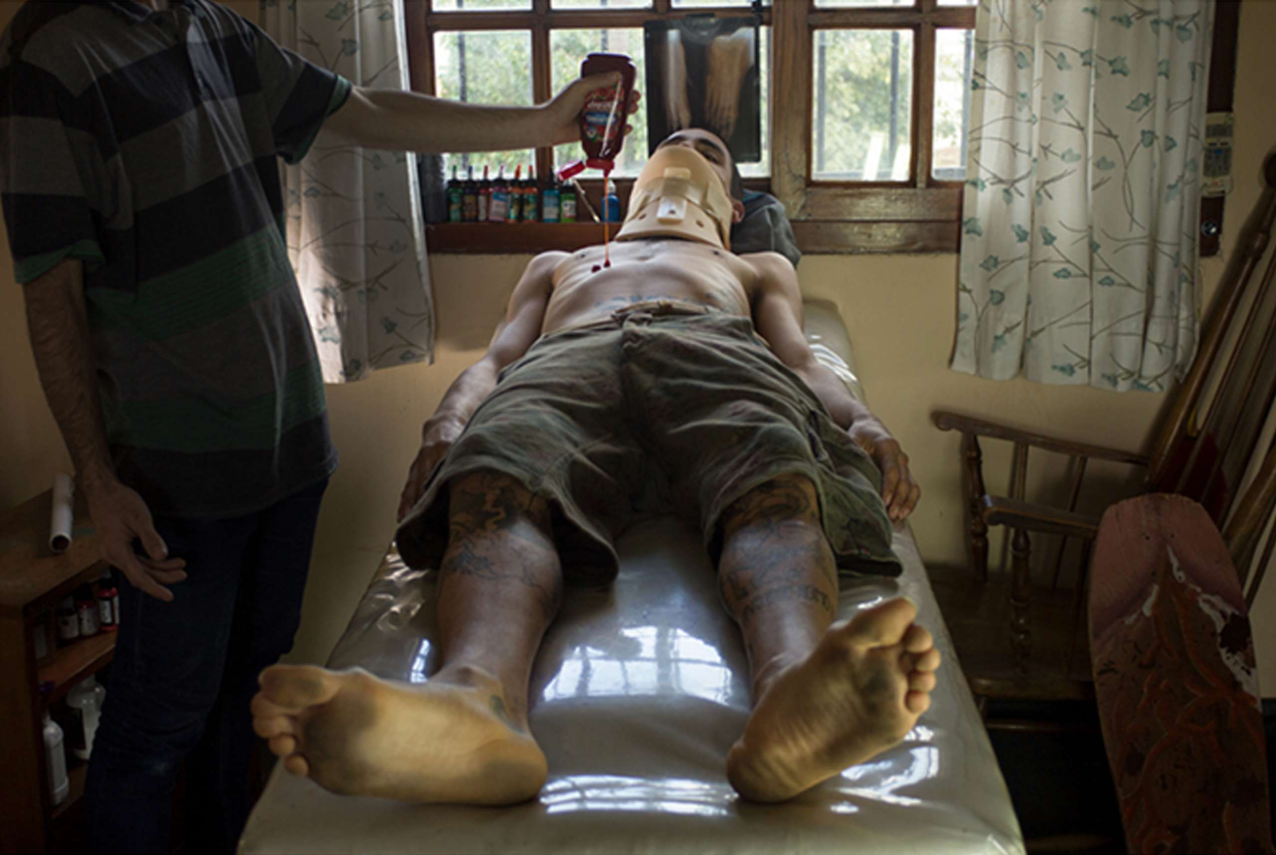 El personaje yacente de Los Picoletos es una burla velada y asumida desde la percepción de las nuevas masculinidades, el joven aparentemente salido de un aparatoso accidente, al igual que las imágenes de las que se apropian y resignifican en su versión, tiene el torso desnudo y se ubica en la famosa posición, lo único que parece manifestar su estado alterado es el collarín que porta, pues semeja más un juego en el derrame de salsa tomate sobre su cuerpo, junto a todos los condimentos que rodean a esta irónica escena que es completada por la tabla como skates que lo identifica como perteneciente a una tribu urbana, manejadora de una multiplicidad de códigos con los que es posible mezclar temporalidades diversas y con las mismas cuestionar los imperativos socioculturales habituales del «Sé un hombre».
