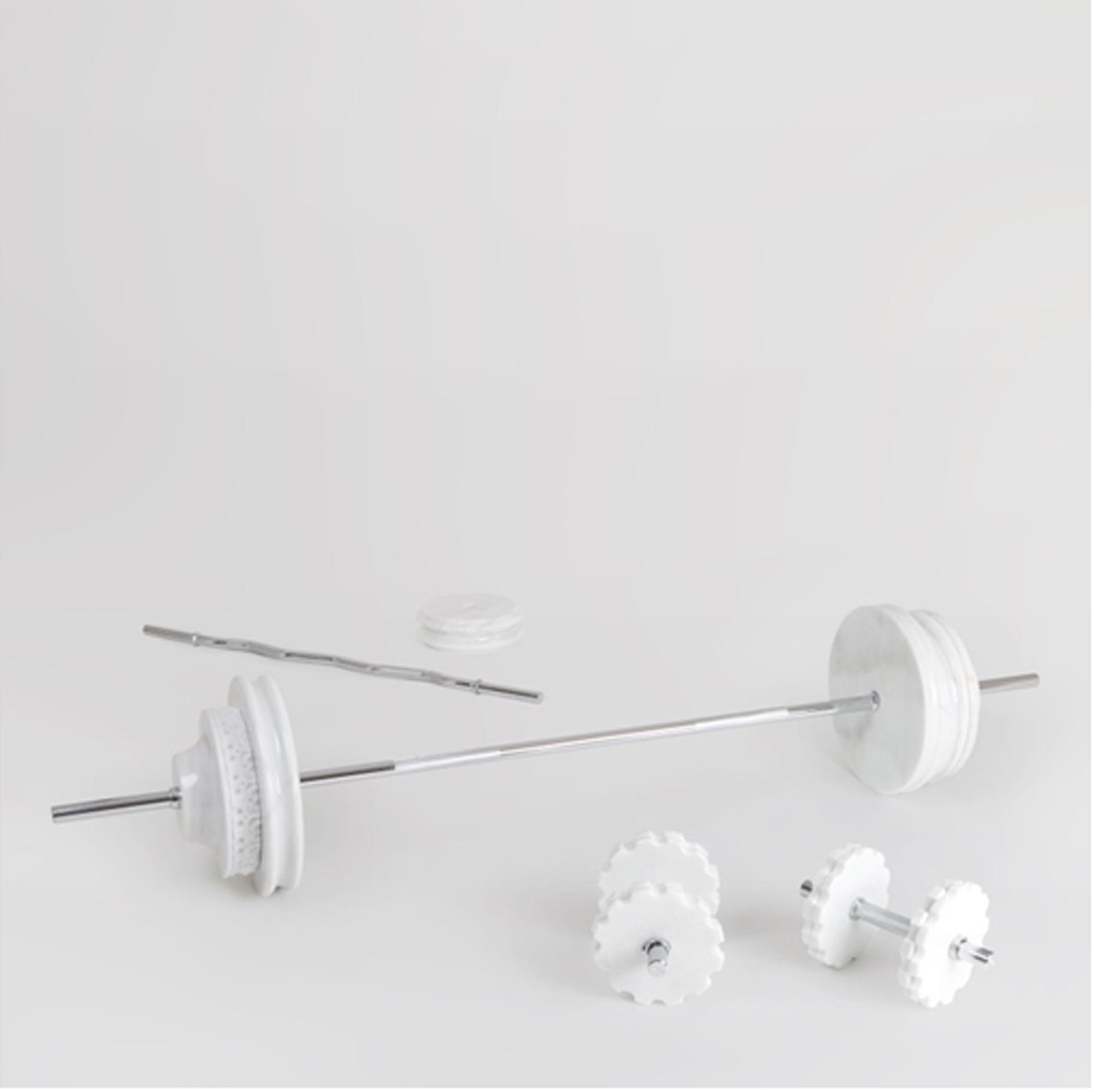 En este sentido, el artista venezolano Cristian Guardia realiza su instalación Hyperbolae (2018), en la que toma los elementos de ejercitación como centro de significación conducidos a la presencia de otra temporalidad en la utilización de refinados fragmentos de columnas clásicas provenientes de los órdenes griegos como ideal de belleza. Hyperbolae (Img.3) es la evidencia del peso soportado por el sujeto masculino ante el deseo de poseer una figura heroica de cuerpo musculado desprendido de toda humanidad, en la afirmación de lo físico con estandarte esencial de la ilusio viril que tiñe la historia de lo masculino, en tanto al cuerpo deseado, y que el artista evidencia en la ambigüedad de la instalación como herramienta, en tanto ejercicio, y como elemento puro de contemplación, pues solo un ser dotado de una fuerza suprema tendría la posibilidad de levantar los 180 kg de peso aproximado que el artista ha dispuesto en el kit de barras de musculación y mancuernas y al mismo tiempo mantener la inmaculada presencia del blanco mármol Macael.