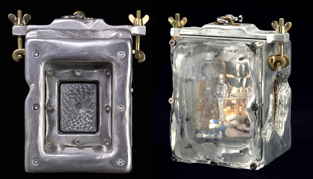 La estenopeica submarina “Yemayá” usa placas negativas 4” x 5”, y está hecha de aluminio, acrílico, latón, criaturas marinas y perlas. Un pequeño altar a la diosa del océano en la santería, Yemayá, está en la parte posterior de la cámara. Las imágenes que ha capturado con este dispositivo tienen una belleza etérea que lleva la fotografía estenopeica a un nivel nuevo y maravilloso.