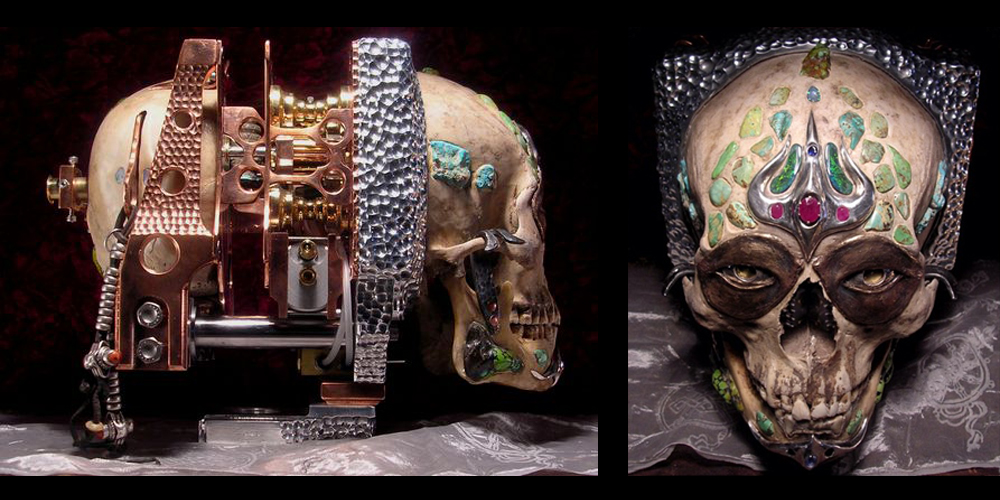 La cámara de este proyecto se denomina “Yama”, en honor al dios tibetano de la muerte. Está hecha de aluminio, titanio, cobre, latón, bronce, plata, oro, cuatro zafiros, tres rubíes turquesa de Asia y América, y nueve ópalos incrustados en un cráneo tibetano de 500 años. La cámara tiene un par de estenopos, uno en cada cavidad ocular que crea un efecto estereográfico. Un divisor corre por la mitad del cráneo creando dos cámaras separadas. El sistema de carga de película es neumático. Un tanque de aire de 300 psi en medio de la cámara alimenta dos pistones neumáticos para mover el soporte de película hacia adelante y bloquearlo en su lugar. El interruptor para abrir y cerrar la cámara de la película se encuentra debajo de la mandíbula, como se aprecia en detalle en el video anterior.