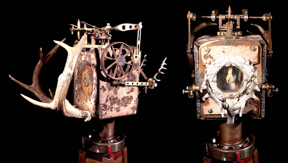 Al igual que las otras cámaras de esta selección “Ciervo” utiliza placas negativas de tamaño 4″ x5″ y está confeccionada de acero, aluminio, bronce, cobre, latón (placa de 3/4″ encontrada en el desierto cerca de México), balas, hueso, marfil y la mano tallada de una figura de Cristo del siglo XVIII que se encuentra en la parte posterior de la cámara.