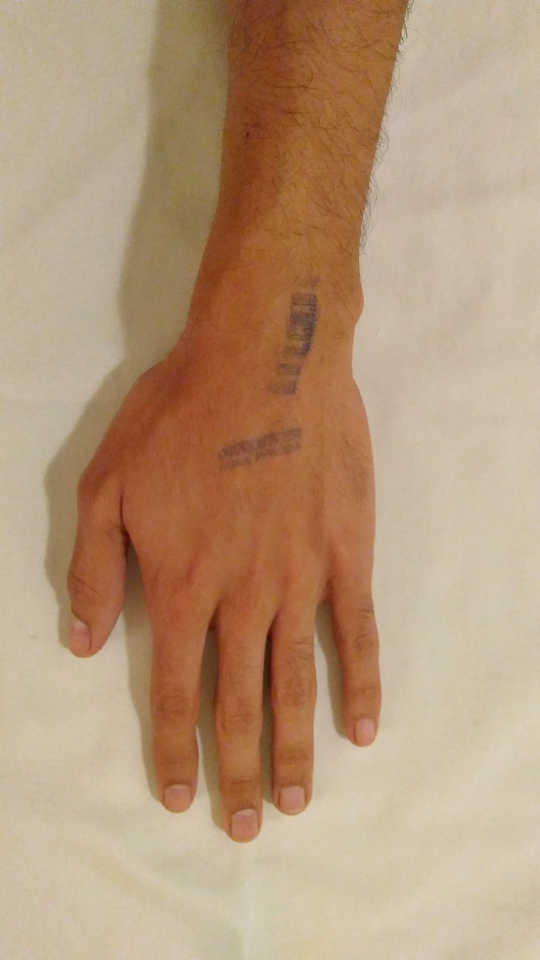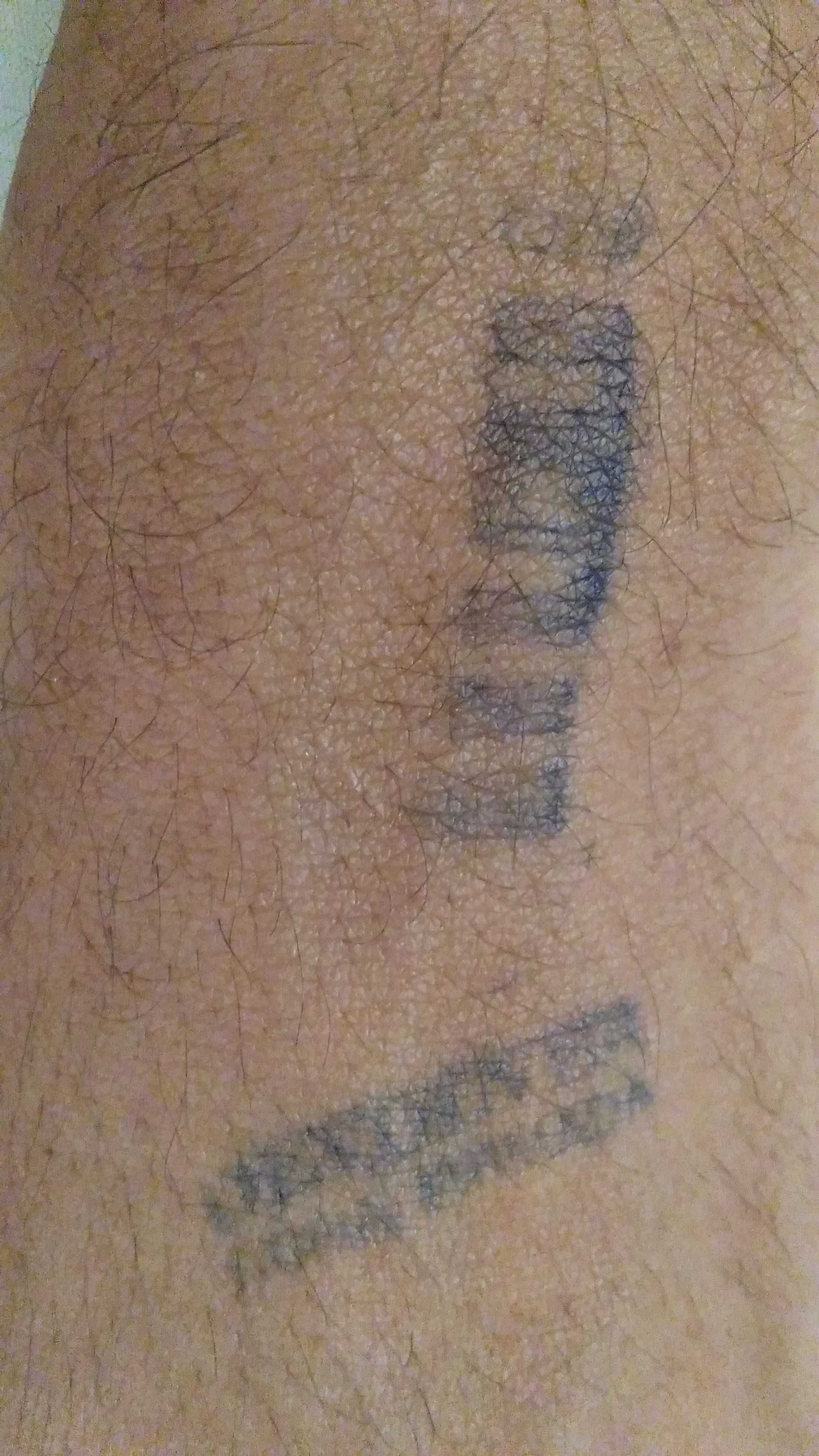 Sólo los sellos en mi piel y el código garabateado e ilegible en un trocito de cartón.