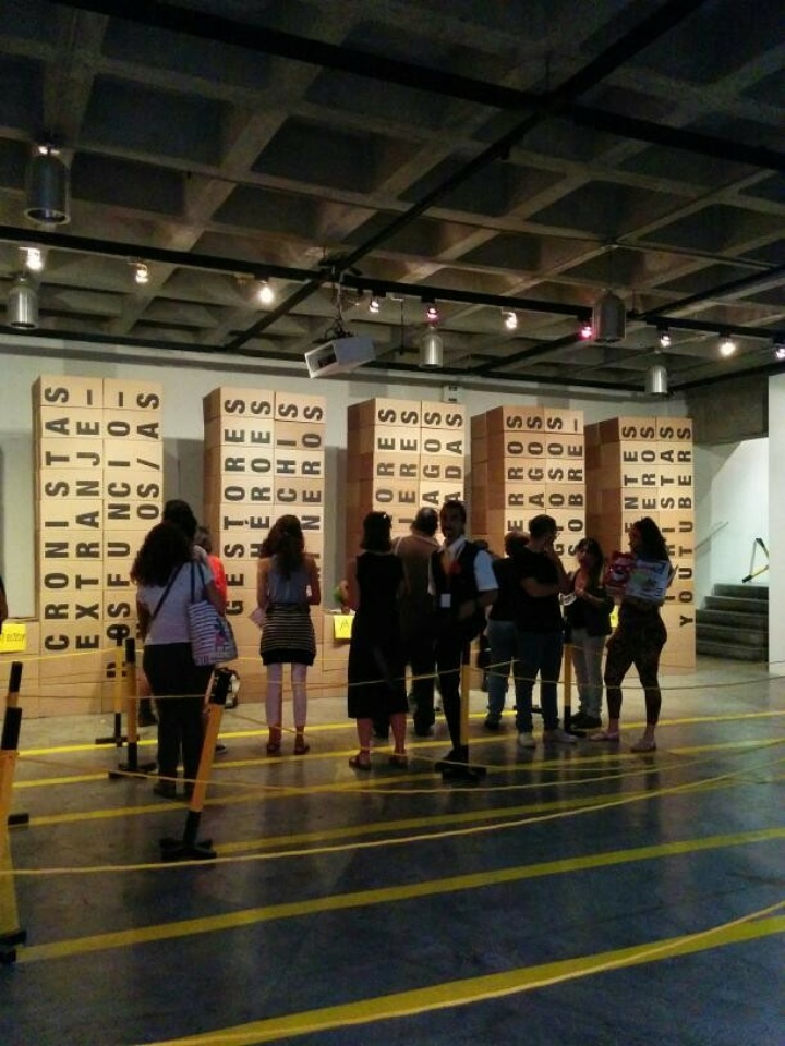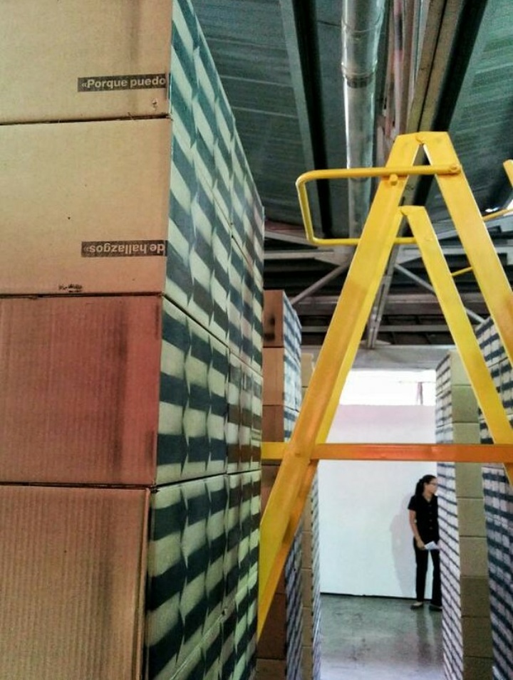 Llego a la entrada de La Caja del Centro Cultural Chacao, veo hacia adentro y distingo una pared de cajas de cartón al fondo, cada caja lleva impreso un carácter en tinta negra, y juntas forman palabras como “GESTORES”, “FUNCIONARIOS/AS”, “MUJERES”, “MENORES”, “TURISTAS”, “NAUFRAGOS”; la pared de cajas al fondo tiene espacios vacíos, similares a taquillas, donde puedo ver a personas interactuando.