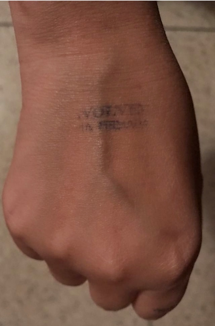 Me quedo y lo veo meter a otra gente a la sala. Los atiende y despacha. Me ignora. Pasa un rato así, por lo que decido volver a salir. “Le dije que esperara detrás de la línea amarilla.” Entra otro grupo y se repite el proceso, pero ya sé qué decir. “Vengo por mi pasaporte, pero me hicieron devolverme sin nada.” Frunce el ceño. “Eso es que te faltó un sello”. Me marca nuevamente la mano: “ANULADO”, se lee ahora en mi muñeca izquierda.